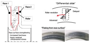 The geometry of a thrust needle roller bearing causes “differential slide” due to the difference between internal and external circumferential speeds on the roller raceway. Thus, an issue of this bearing is flaking easily generated from the race surface.