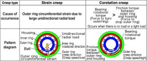 When creep occurs, the bearing and the housing rub together, causing mutual wear, and triggering both wear, causing axis core displacement or tilt. Consequently, poor gear engagement can lead to problems such as decrease transmission function and abnormal noise.